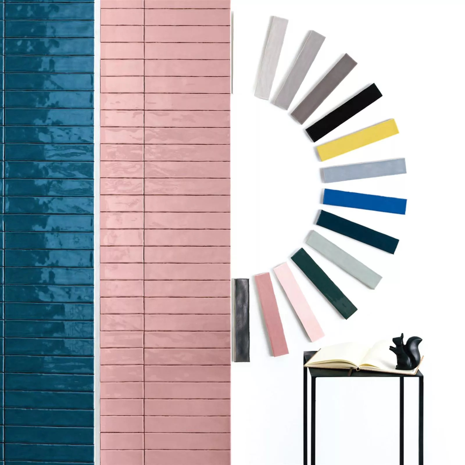 Montrealin seinälaatat eri väreissä, aaltoilevalla, lasitetulla pinnalla kivitavaraa. Kiiltävä pinta luonnollisella reunalla.