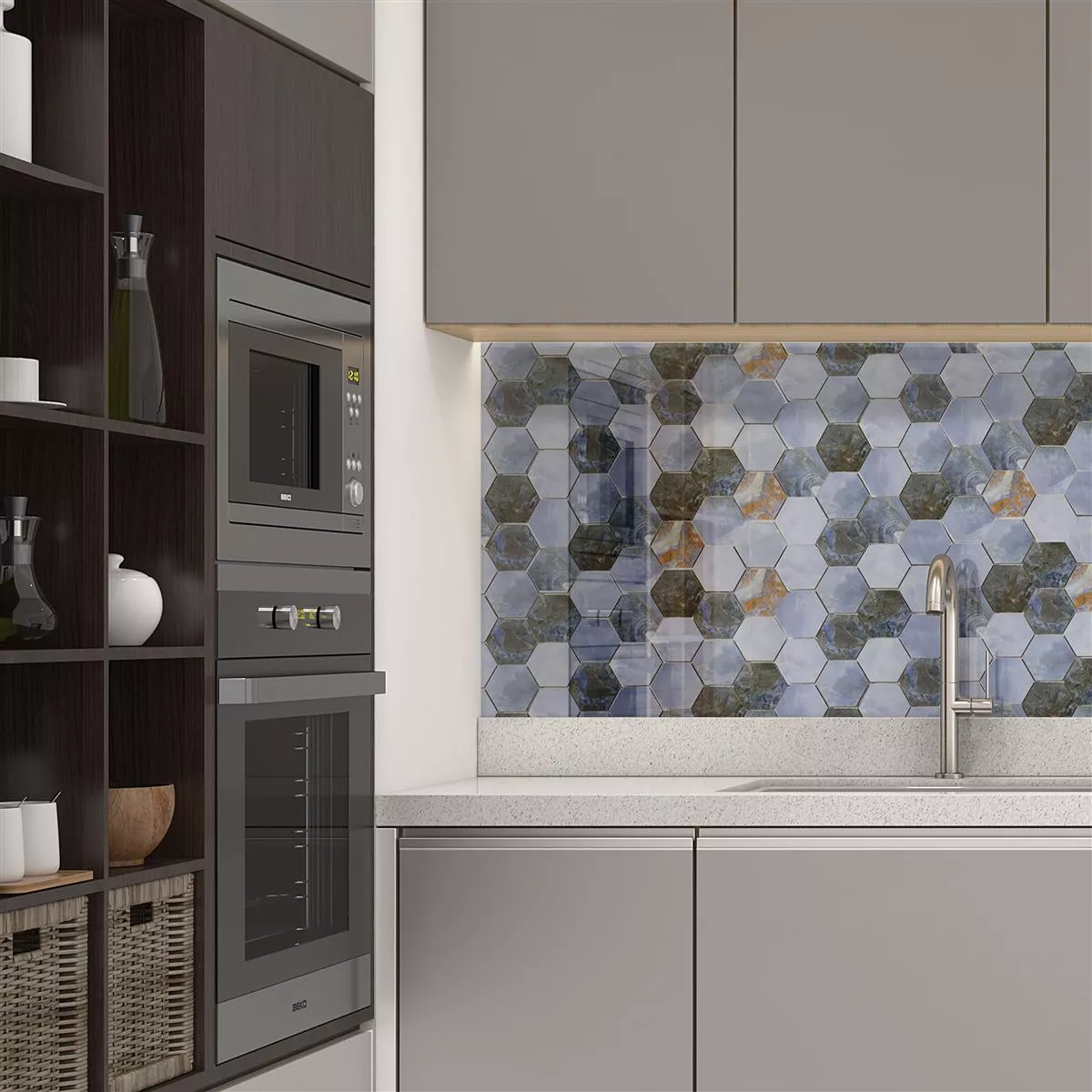 Oikaistut reunat antavat laatoille tarkan geometrian, joka mahdollistaa virheettömän asennuksen. Niiden paksuus on 10,7 mm ja kivikoko 88 x 71 mm, joten ne korostavat paitsi visuaalista tasoa myös rakenteellisesti. Kuusikulmio muotoilee geometristen muotojen modernia tulkintaa, ja se sopii saumattomasti nykyaikaiseen sisustukseen.