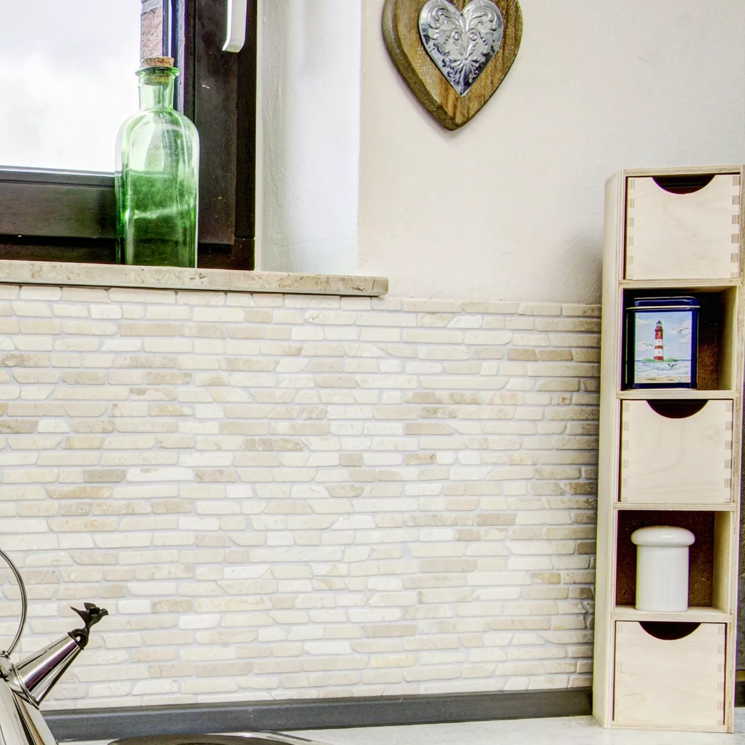 Huomaa, että tämä artikkeli on käsin näyte Bali Biancone Beige Brick -luonnonkivimosaiikkilaatta , jonka näytekoko on noin 10x10 cm .