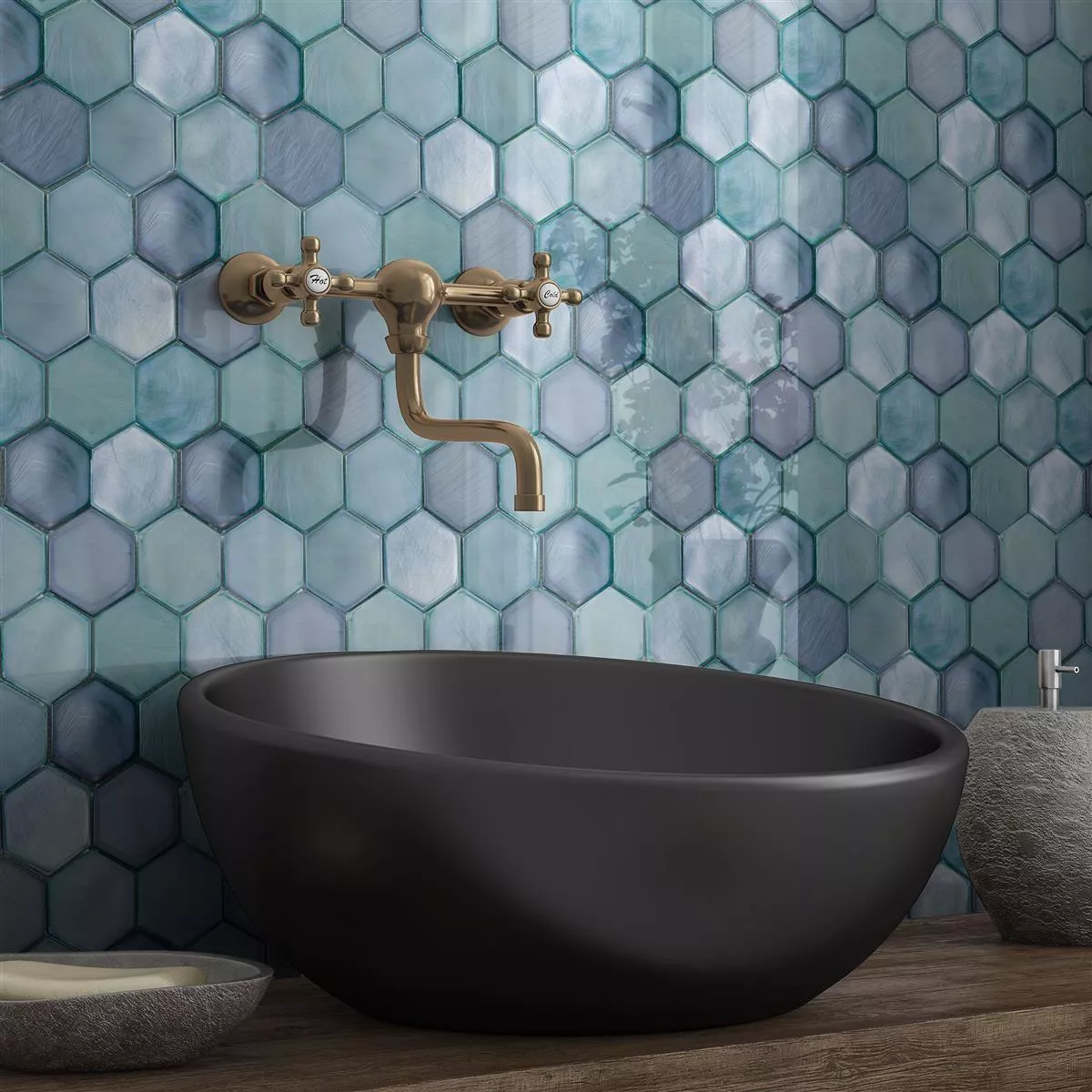 Merenvihreät Andalucia Hexagon lasimosaiikkilaatat esittävät itsensä moderneina ja virkistävänä seinäsuunnittelun elementteinä tiloihin, kuten kylpyhuoneeseen, keittiöön, olohuoneeseen ja suihkuun. Eloisa merenvihreä antaa laatoille houkuttelevan ja virkistävän tunnelman. Kiiltävä pinta helmiäisefektillä antaa myös laatoille tyylikkään ilmeen.