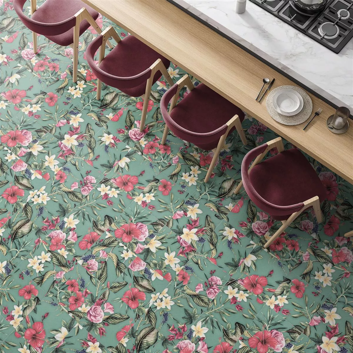 Näiden laattojen vihreä väri antaa huoneeseesi raikkautta ja eloisuutta. Kukkailme luo luonnollisen ja harmonisen tunnelman. Suunnittele huoneesi uudelleen ja tuo kotiisi luonnollista raikkautta näillä vihreillä posliinikivilaatoilla.