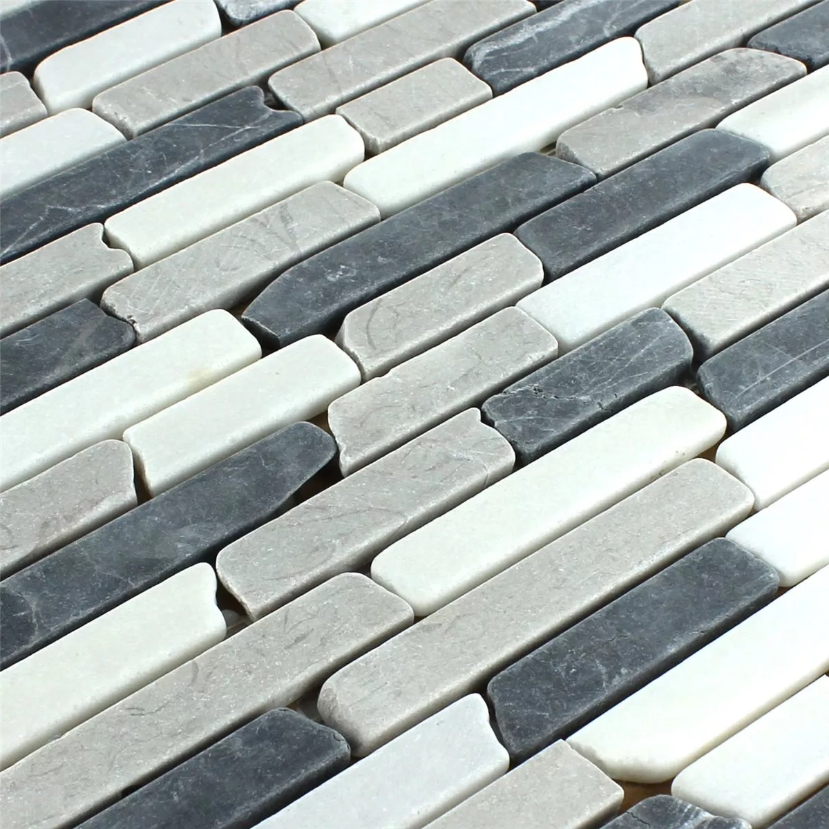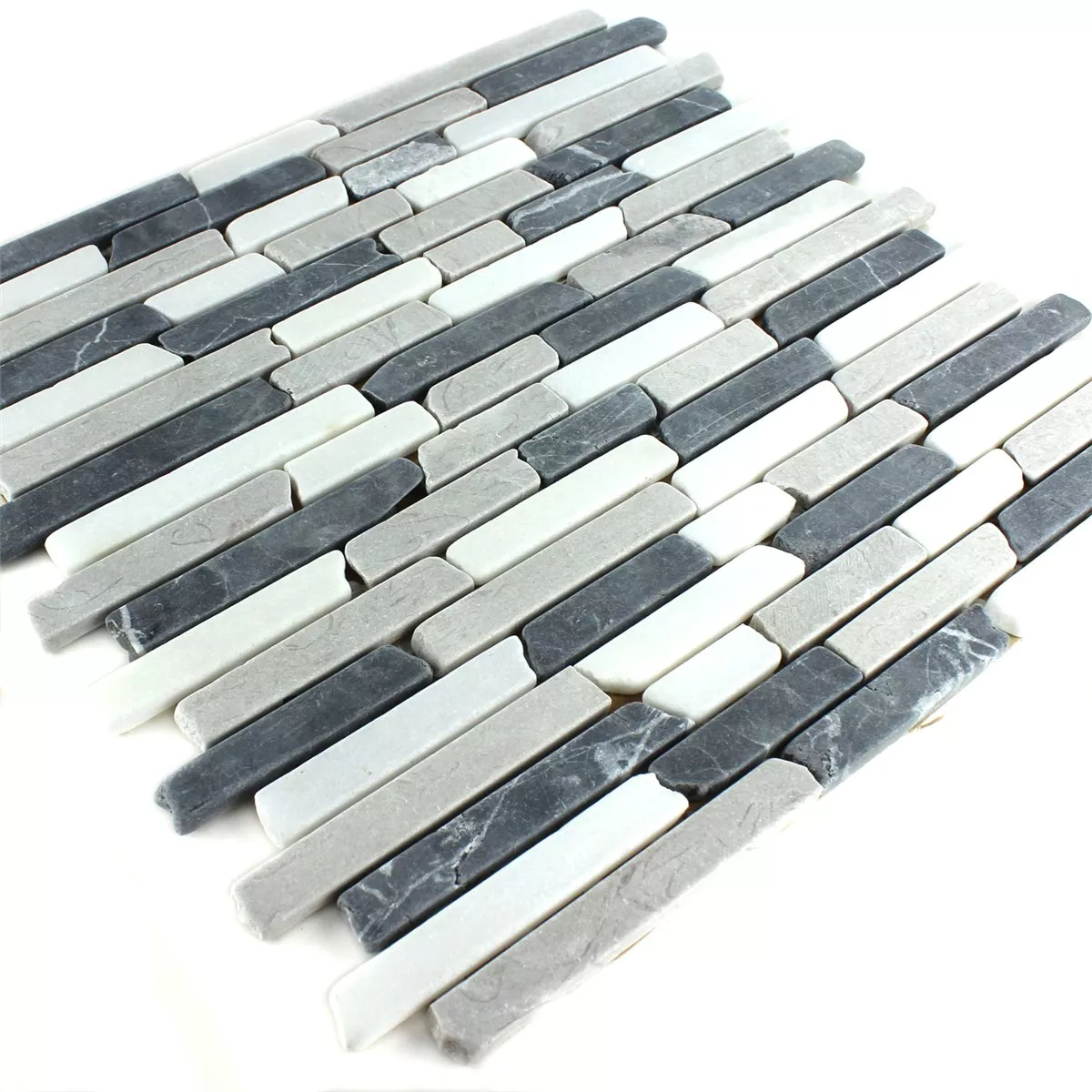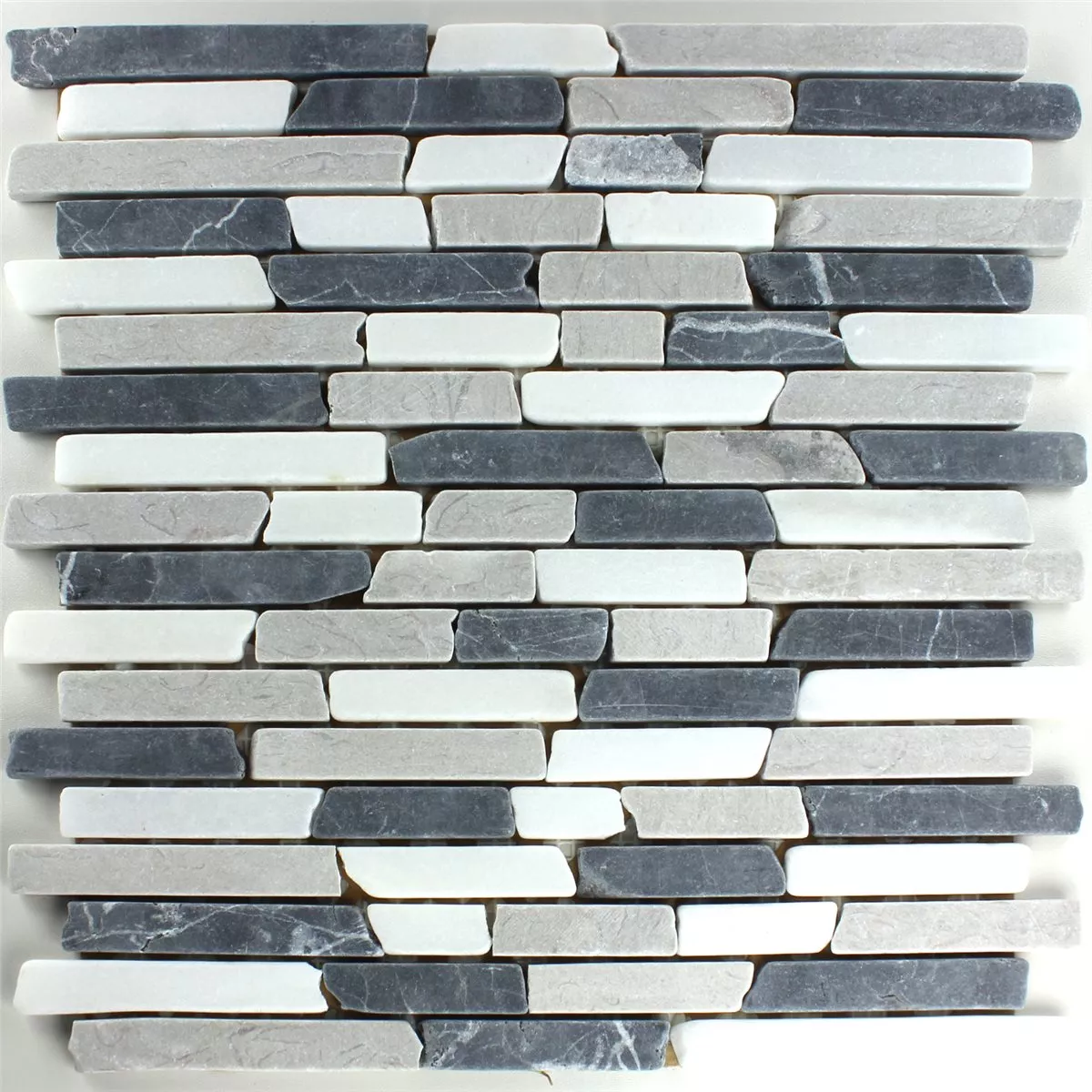 Marmorimosaiikin väri Harmaa, Botticino mattapintaisella pinnalla, mattokoko on 30,5x32,2 cm ja kivikoko 15x25mm - 105x15mm. Yksittäisten kivien paksuus on 0,8 cm.