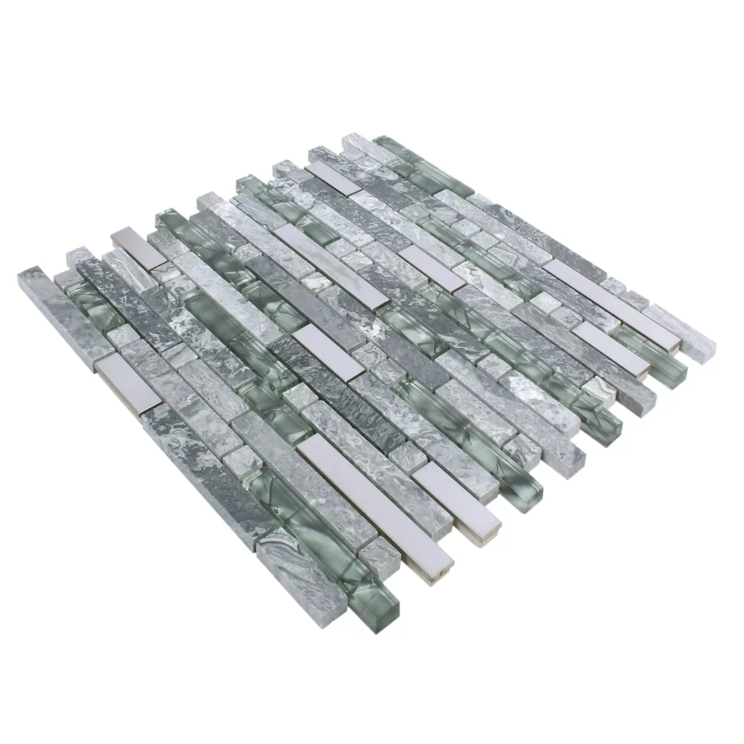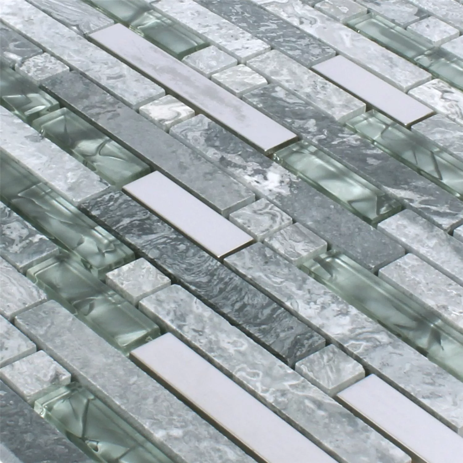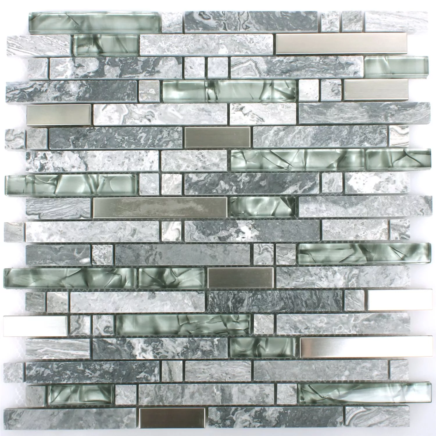 Näiden epätavallisten mosaiikkilaattojen sekoitus on harjattu, kiiltävä ja kiillotettu. Materiaaliyhdistelmä on aasialaista tyyliä ja harmaata. Kaiken kaikkiaan käytetään luonnonkiviä, lasia ja ruostumatonta terästä. Kaikki osat ovat suorakaiteen muotoisia, kivet ovat luonnollisia. Lasi hohtaa kiiltävän harmaana kevyesti harjatun ruostumattoman teräksen vieressä. Kaikki laatat levitetään matolle, joten niitä on helppo käsitellä. Yhdistelmä useiden mattojen kanssa on mahdollista ilman ongelmia. Mosaiikkilaatat sopivat erityisen hyvin seinänpäällysteiksi.