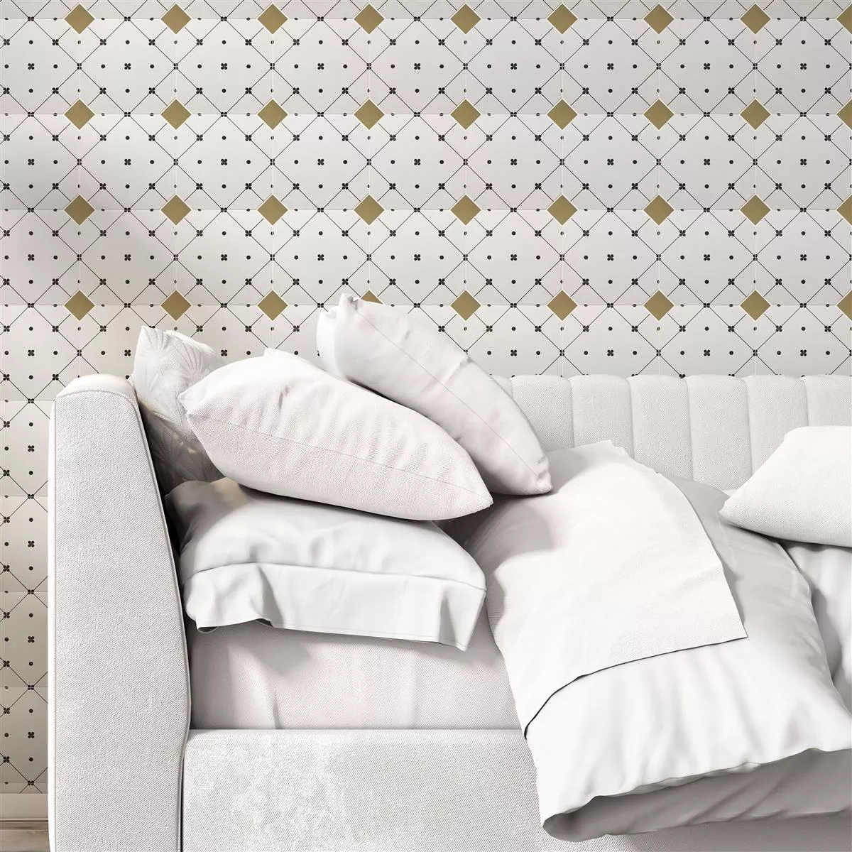 Yksi paketti sisältää runsaat 1 m² laatat viehättävässä mustavalkoisessa sisustuksessa. R11/C-luistokestävyyden ansiosta ne sopivat erityisen hyvin kosteisiin tiloihin, kuten kylpyhuoneisiin, keittiöihin ja suihkuihin.