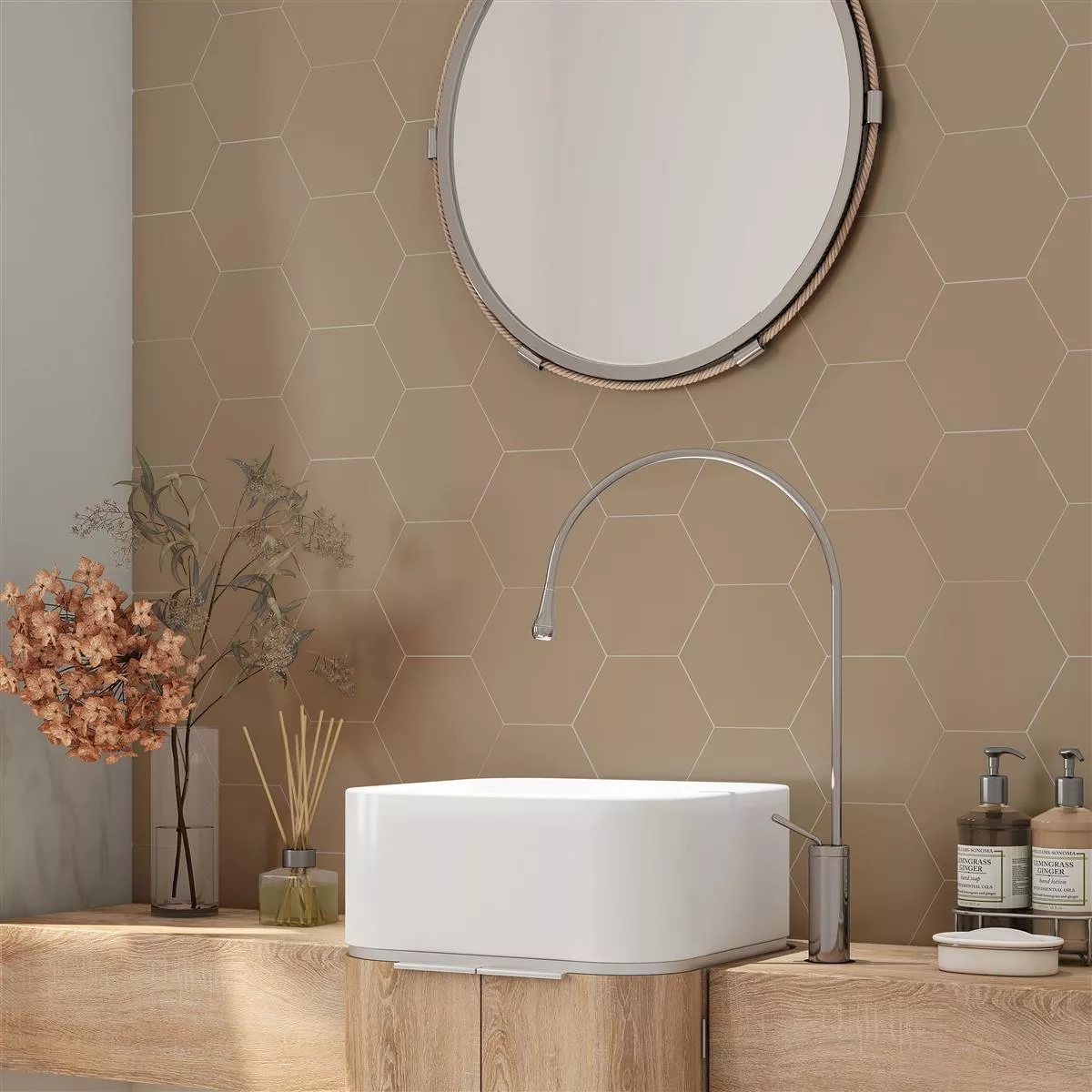 "Modena Hexagon Uni Sand" posliiniset kivitavaralaatat yhdistävät estetiikan ja toimivuuden yhdessä. Näyttävällä kuusikulmiolla ne luovat ainutlaatuisen tunnelman kosteaan tilaan, suihkuun, kylpyhuoneeseen, keittiöön, olohuoneeseen ja sisätiloihin. 10 mm:n paksuiset ne tarjoavat vankan pohjan, kun taas R10-liukasuoja takaa turvallisuuden.