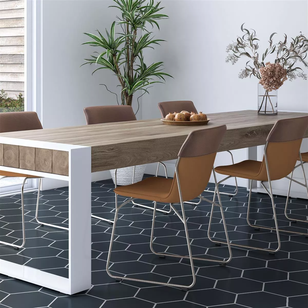 "Modena Hexagon Uni tummansiniset" posliiniset kivitavaralaatat luovat tyylikkäitä aksentteja viehättävällä kuusikulmiolla ja tummansinisellä värillään. Niiden paksuus on 10 mm ja liukastumisenestokyky R10, joten ne sopivat erinomaisesti kosteisiin tiloihin, suihkuihin, kylpyhuoneisiin, keittiöihin, olohuoneisiin ja sisätiloihin.