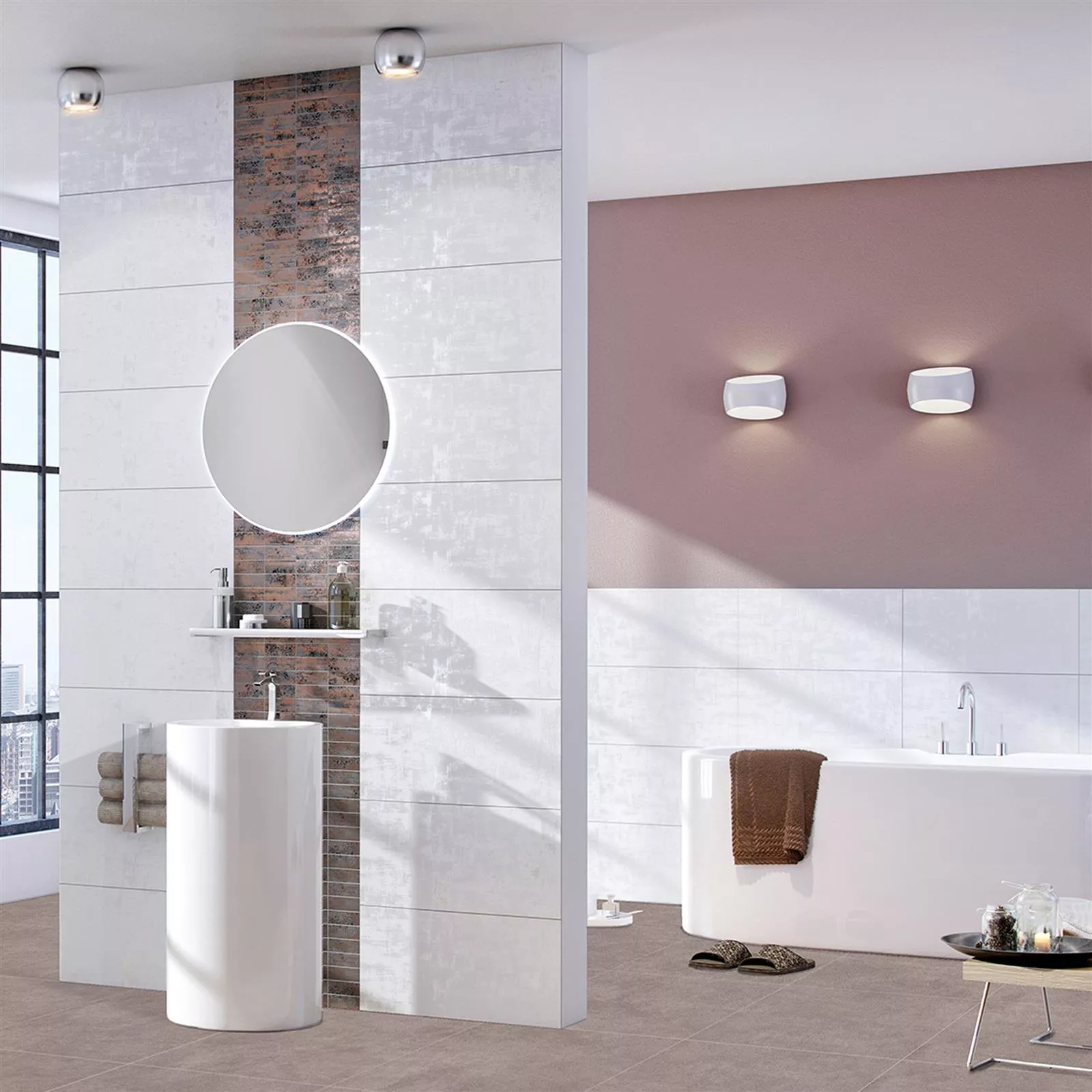 Laatat ovat väriltään ja muotoilultaan valkoisia ja strukturoituja, joten ne tarjoavat siistin ja elegantin ulkonäön. Laatan pinta on matta ja materiaali on normaalipaksuista ja halkaisijaltaan paksuista kivitavaroista.