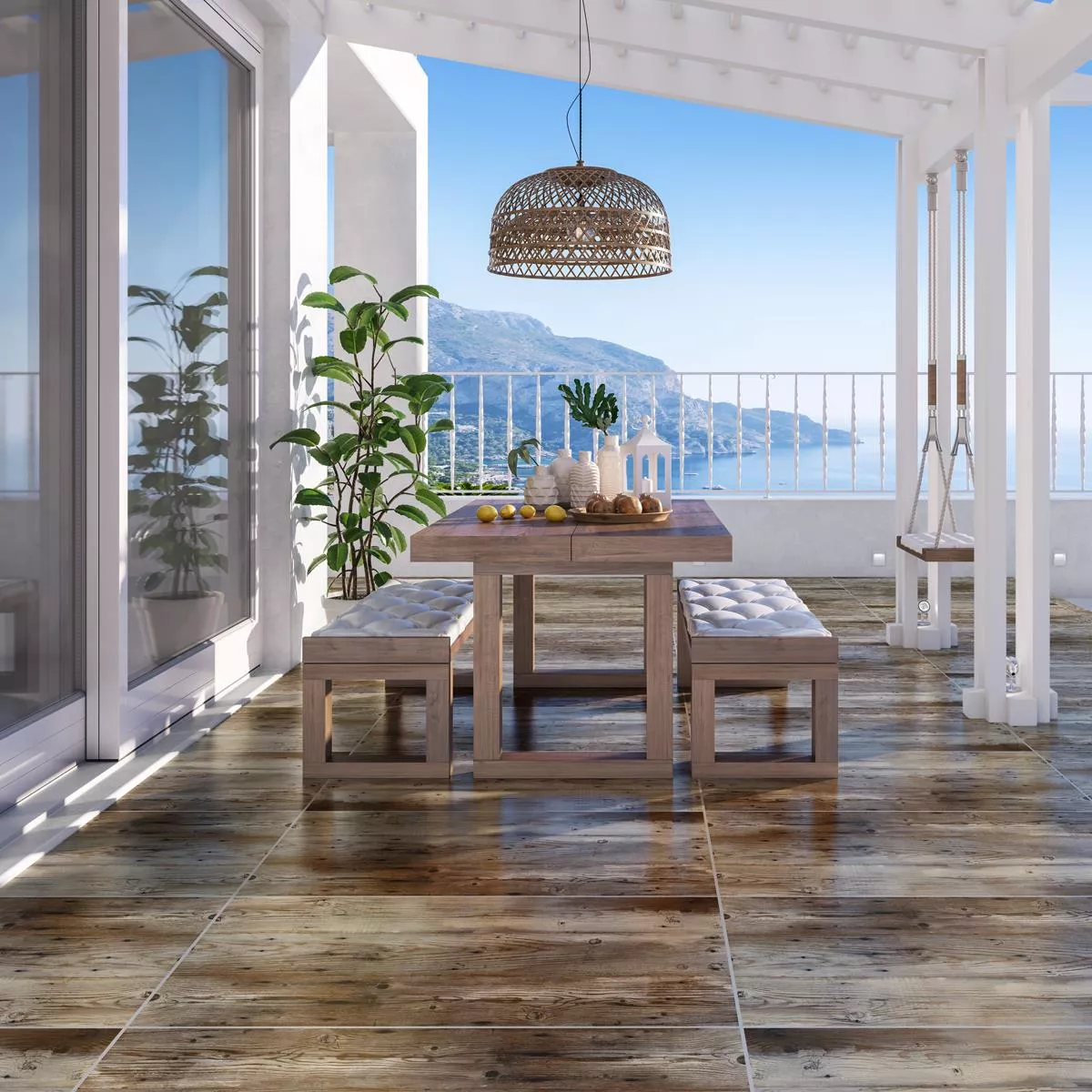 Korkealaatuisesta posliinikivitavarasta valmistetut laatat tarjoavat erinomaisen kestävyyden ja kestävyyden. Matta, lasitettu pinta jäljittelee aitoa puun ilmettä, joka on vaikuttava sekä sisällä että ulkona. Korkean kulutuskestävyyden (hankausluokka 4) ja R10 liukastumisenestonsa ansiosta nämä laatat ovat erityisen turvallisia ja kestäviä.